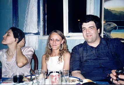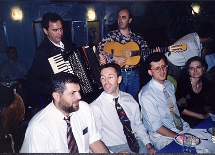 I tako stigosmo do petnaestogodišnjice... Slike su bolje, tu je već bio bolji foto-aparat, jelda, napreduje tehnika. Proslava je bila u nekom kao brodu gde smo se bezdušno skuvali, tako da su svi dobro oznojeni. Recimo oni na ovoj slici - Jeca Protic, Stojan Cucuz i Branimir Bijele.